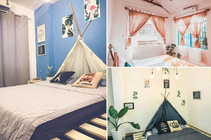 Điểm ấn tượng riêng biệt của Homie nữa chính là sự hòa trộn của những sắc màu tươi tắn trong một không gian riêng tư không quá rộng lớn. Tại Homestay có đến 3 phòng ngủ với 5 giường, đáp ứng đầy đủ nếu bạn có đi theo nhóm từ 7-8 người. Phòng ngủ chính được bài trí vô cùng thoáng mát, tràn ngập ánh sáng tự nhiên, với tấm rèm đặc biệt, mang màu sắc nhã nhặn.