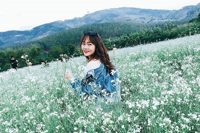 Bên cạnh sắc tím là sắc trắng của những bông Cải Trắng xinh đẹp nổi bật trên nền lá xanh dưới ánh mặt trời. Những tấm hình của bạn sẽ lung linh và thêm phần quyến rũ.