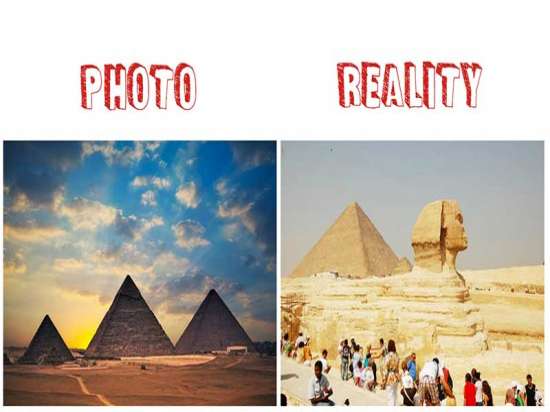 Lên mạng tìm kiếm hình ảnh về Kỳ quan thế giới này sẽ cho ra các bức hình đẹp và ai cũng trầm trồ về sự kỳ vĩ của nó. Không thể phủ nhận Kim Tự Tháp Ai Cập là một trong những công trình ấn tượng nhất của loài người, tuy nhiên khi bạn mục sở thị chúng thì sẽ khá chưng hửng vì nó không khổng lồ như bạn nghĩ, thực tế nó chỉ cao dưới 140m và xung quanh chỉ là một vùng cát rộng lớn. Tất cả đều do các nhiếp ảnh gia đặt góc máy ảnh "lừa tình" mới cho ra những bức hình đẹp như thế.