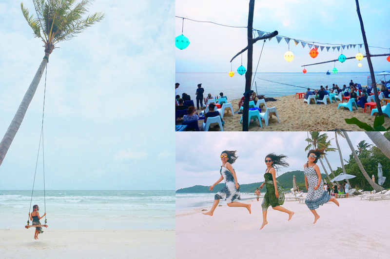 Lúc đến nơi là 10h00 sáng nhưng trời vẫn còn âm u, kéo mây, nên tụi mình nán lại thêm chút xíu để chờ nắng đẹp. Khoảng 11h00 thì trời quang hẳn, hình chụp lên siêu xinh. Mà ở Bãi Sao để "săn" được ảnh đẹp thì chắc chắn đừng bỏ qua chiếc xích đu bên hàng dừa cong cong nhé. Đảm bảo bạn sẽ phải mê em ý ngay thôi.